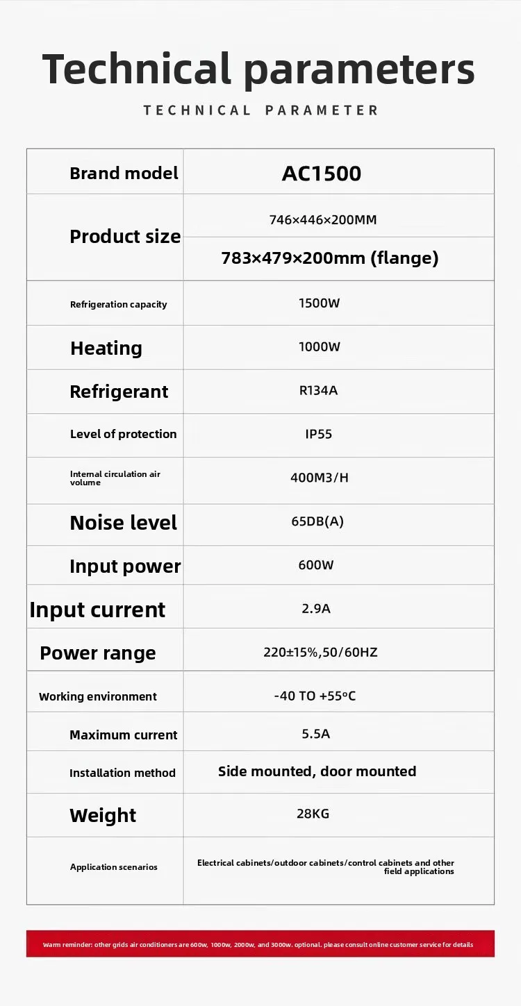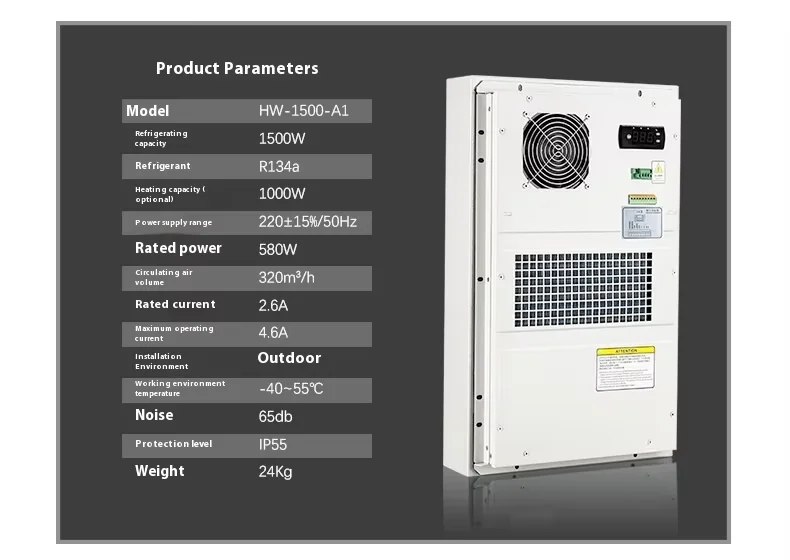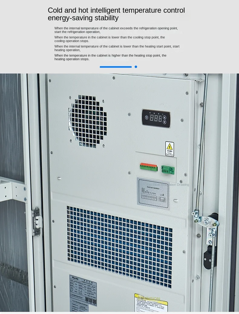 The outdoor cabinet air conditioner adopts advanced heat dissipation technology, which can quickly reduce the temperature inside the cabinet in high temperature environments, ensuring that the equipment can also operate normally in high temperature environments. Efficient heat dissipation performance is the key to ensuring stable operation of equipment. The outdoor cabinet air conditioner has intelligent constant temperature function, which can monitor and adjust the temperature in real time, ensuring that the equipment operates in a stable environment.