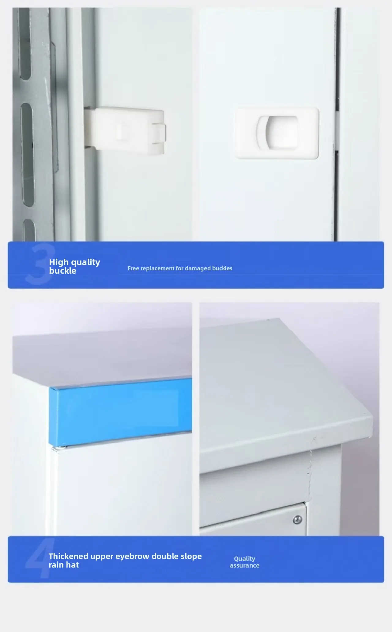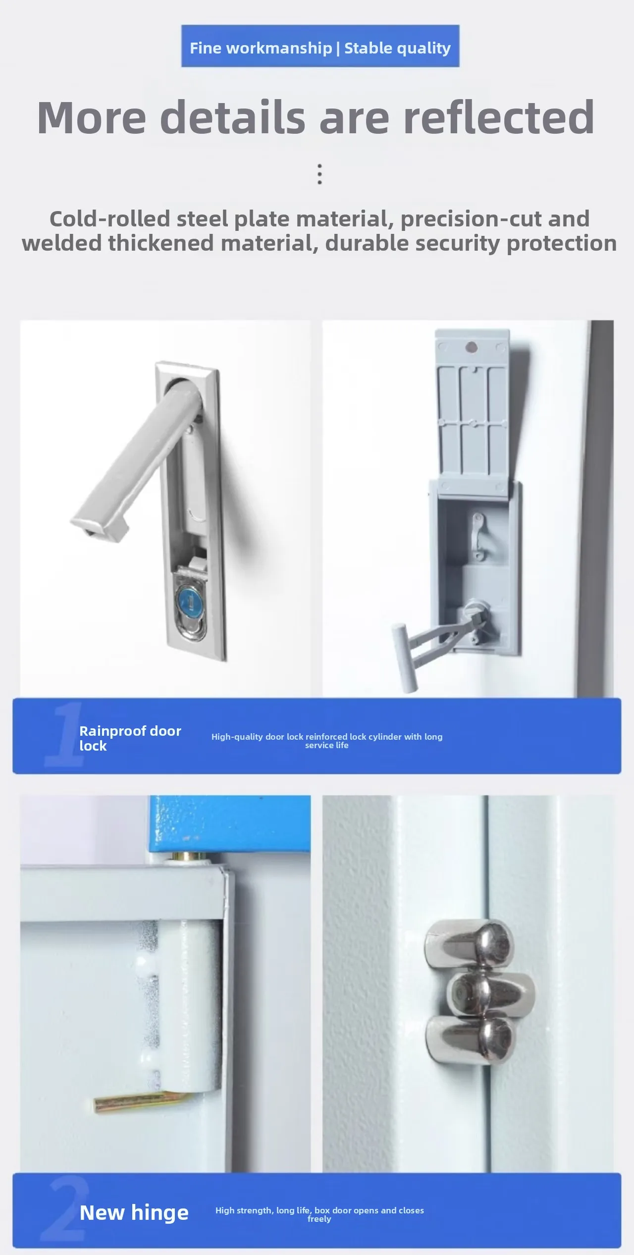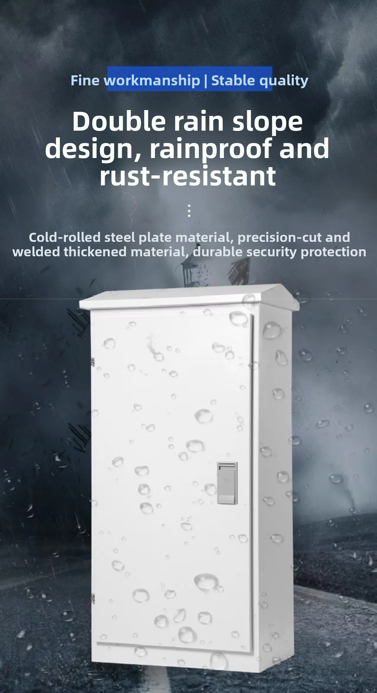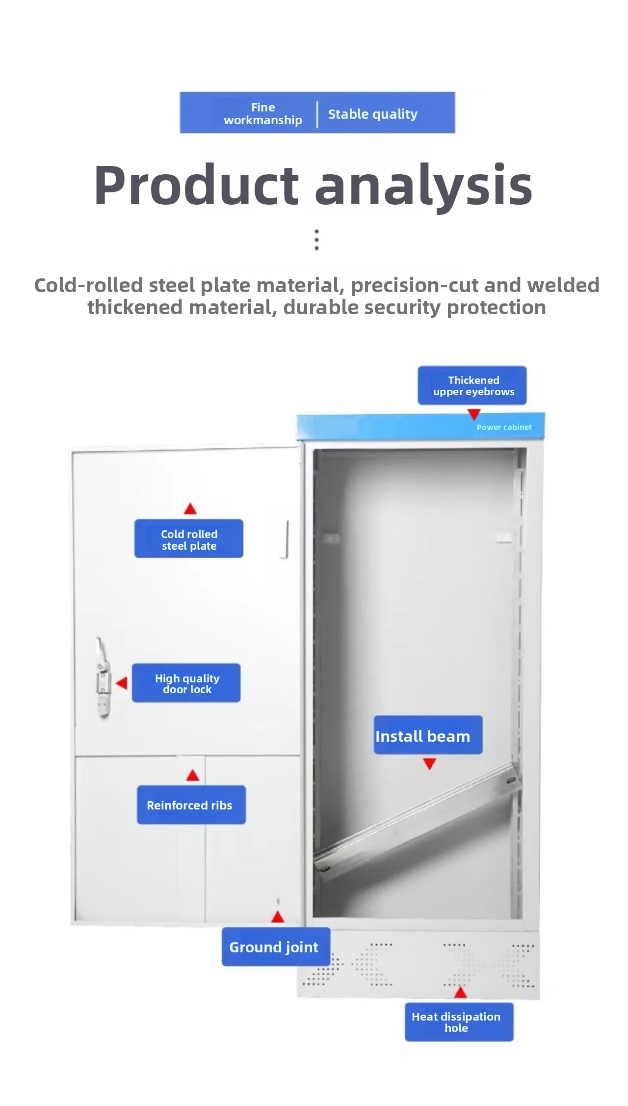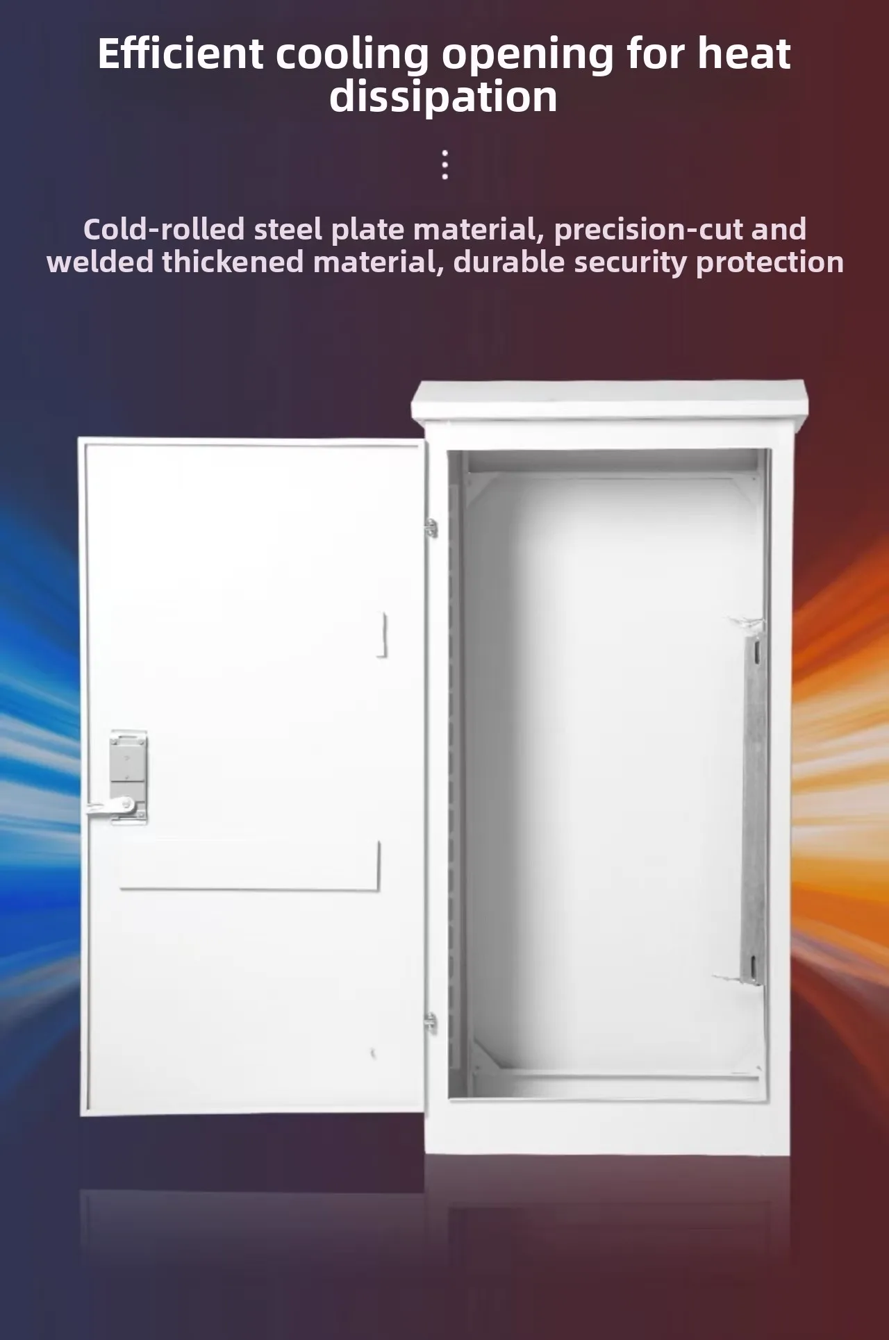 The outdoor cabinet design has good waterproof, dustproof, and rodent proof functions.The box is made of all steel structure and equipped with polyurethane sealing strips.The door uses pin type hinges to prevent dust and water from entering the box.In addition, the cabinet has a rainproof groove structure, further enhancing its adaptability to outdoor environments.The equipment compartment cabinet adopts a ventilation and heat dissipation design to ensure that the equipment maintains a stable temperature during operation.