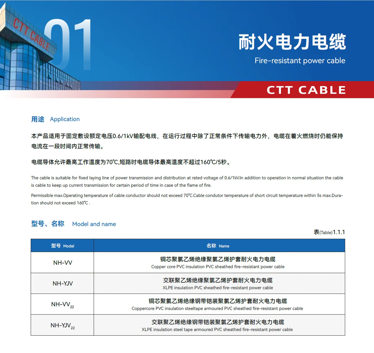This product is NH-YJV/NH-VV Fire Resistant Power Cable with rated voltage 0.6/1kV, adopting copper core conductor and XLPE insulation (NH-YJV) or PVC insulation/PVC sheath (NH-VV) structure.It features excellent flame retardant and fire resistant performance, maintaining stable circuit transmission in fire scenarios, making it a critical wiring product for protecting lives and property.