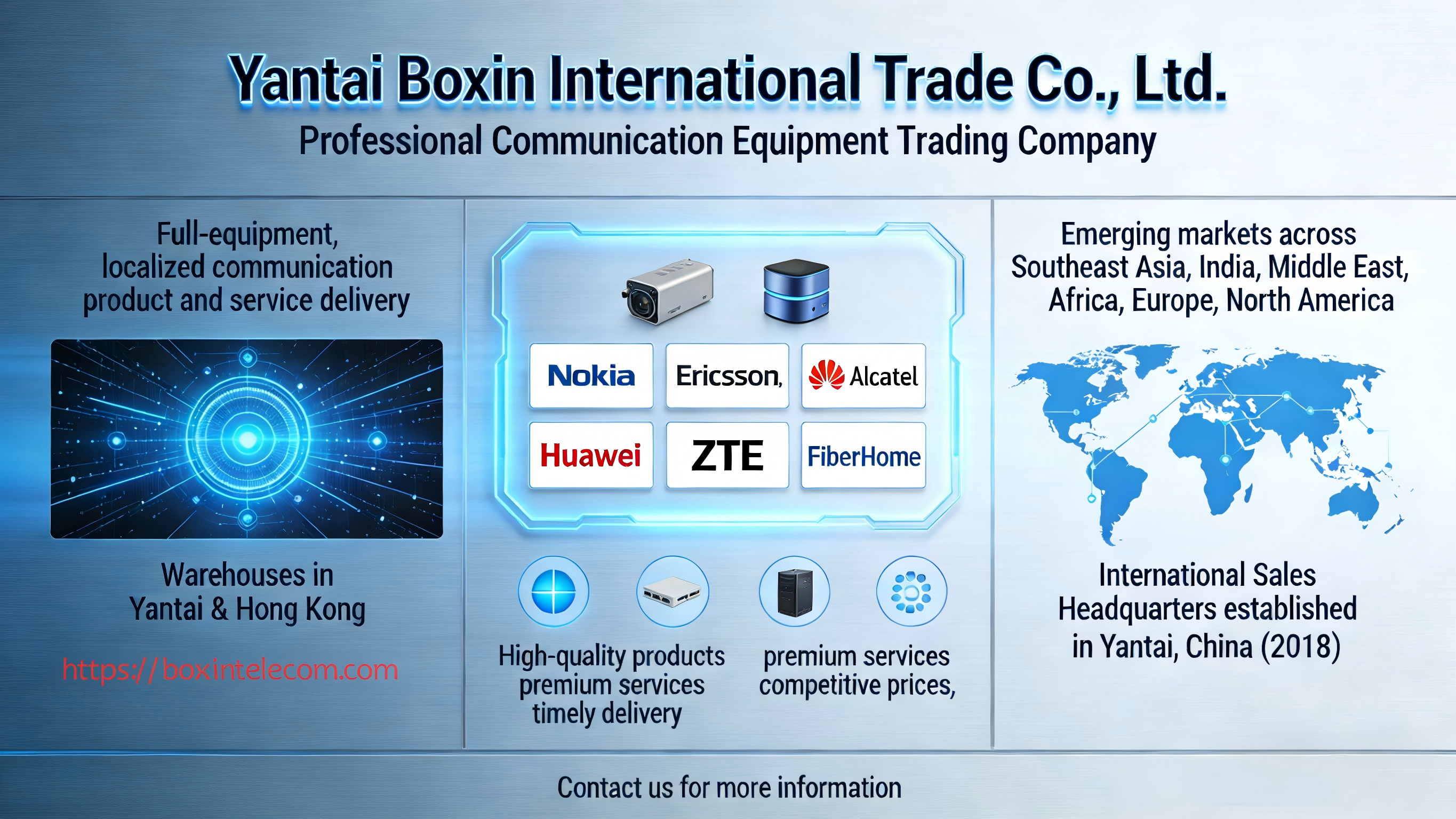 Our company sells RRUs, BBUs, switches, routers, base station antennas, embedded power supplies, transmission equipment, communication power cabinets, storage devices, optical cables and fibers, feeder lines, power dividers, power inverters, OLTs, data communication equipment, optical modules, and other products.