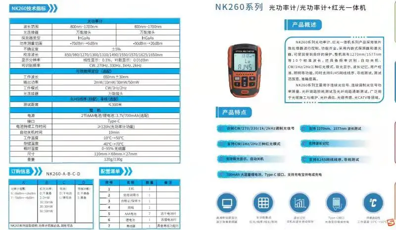 NK260 series OPM and VFL all-in-one machine are controlled by single chip microprocessor with complete functions.It can be well protected by using embedded detector and laser.It has 10 standard wavelengths, such as 1270nm/1577nm.It also has frequency identification, automatic shutdown function, CW/1Hz/2Hz red light modes, wavelength memory, user calibration, and RJ45 network cable sequence and tracking test function. NK260 series is mainly used for continuous optical signal, continuous modulation optical signal power measurement, optical fiber link loss test and optical fiber line on-off test.It is widely used in optical cable construction and maintenance, optical fiber communication, optical cable sensing, Optical CATV and other fields.