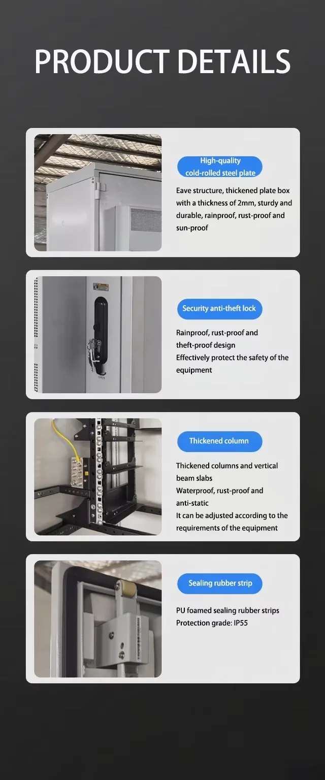 Made of metal or non-metal materials, with a protection level of IP55 or above, it has the ability to prevent dust, water, and corrosion, and can adapt to a wide temperature environment from -40℃ to+60℃.The exterior of the cabinet is mostly made of hot-dip galvanized sheet with a thickness of ≥ 1.5mm, and the metal parts are treated with hot-dip galvanizing to improve weather resistance.Support compartment structure design (equipment compartment, battery compartment, etc.), including heat exchangers, semiconductor air conditioning or direct air cooling systems, which can be quickly deployed and save 70% of floor space.The cabinet door adopts a double opening method, with no exposed screws on the outside to avoid theft through external disassembly.