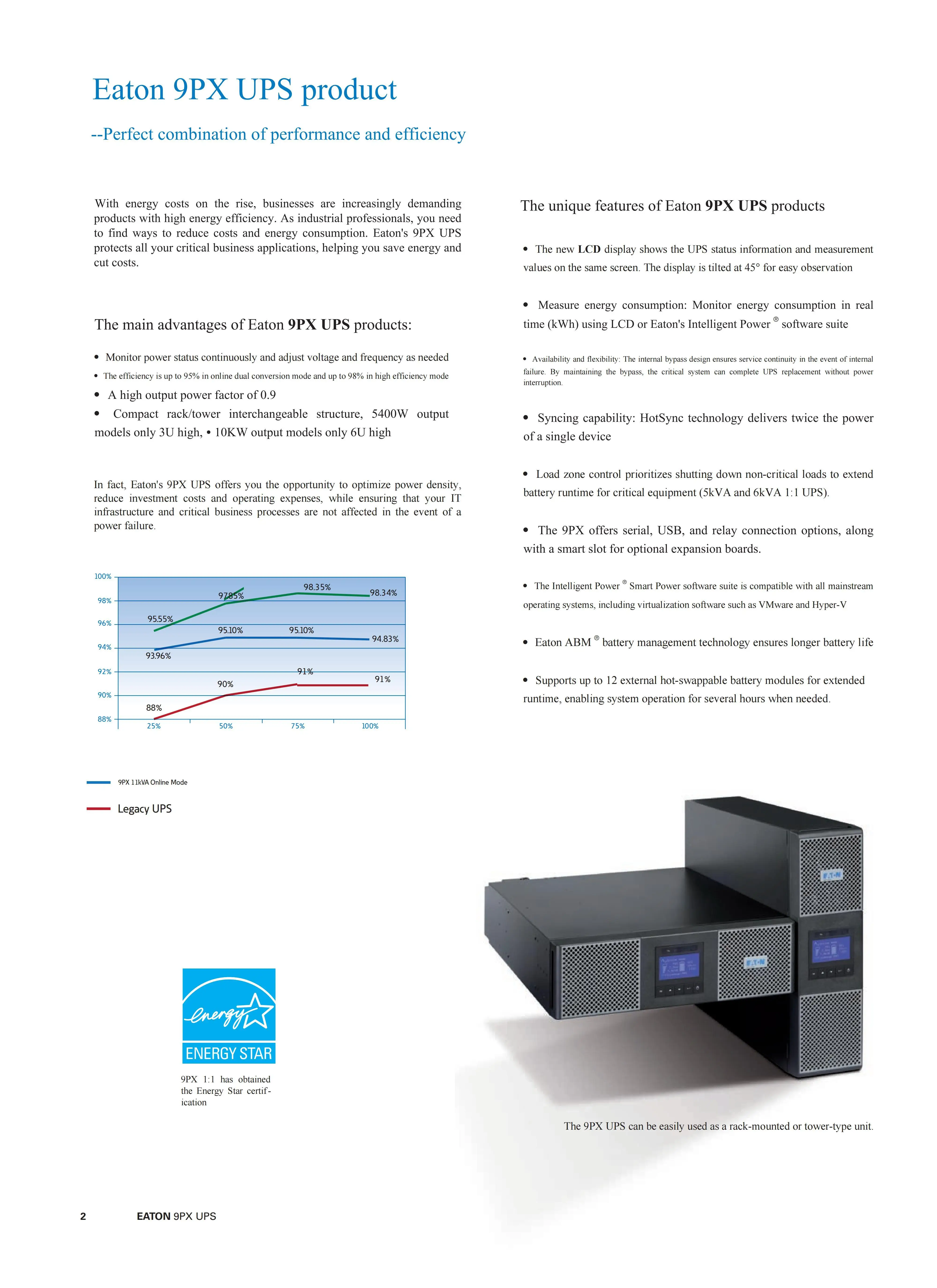With an optimized electrical design and efficiency of up to 99%, the 5PX Gen2 UPS meets the ENERGY STAR® 2.0 standard, significantly reducing cooling and electricity costs. The 5PX Gen2 also supports power consumption monitoring for outlet groups, ensuring business continuity to the greatest extent.