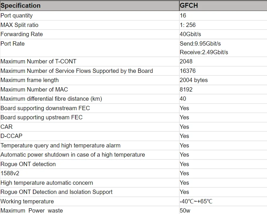 GFCH single board is a 16-port 10G XGSPON OLT interface board,which cooperates with ONU to realize GPON access service.