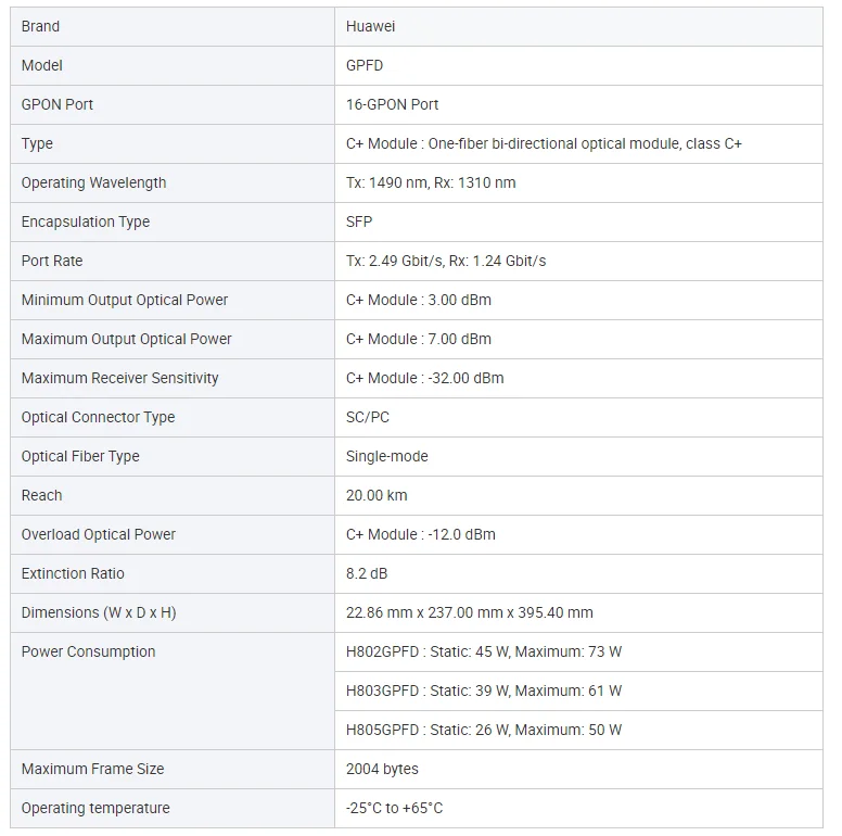 Huawei GPFD Service Board is a 16 port GPON interface card This board offers GPON service access from ONT which get maximum access