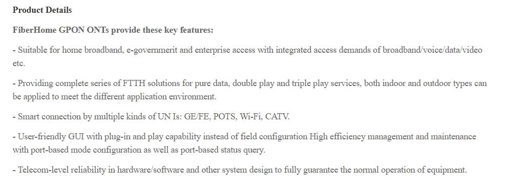 GPON ONTs series equipments are manufactured and developed by FiberHome for home and SOHO users used in FTTH solution.They are