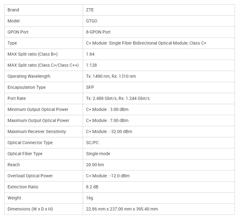 The ZTE GTGO is an 8-Port GPON subscriber card designed to be used with ZXA10 C300 and ZXA10 C320 equipment.