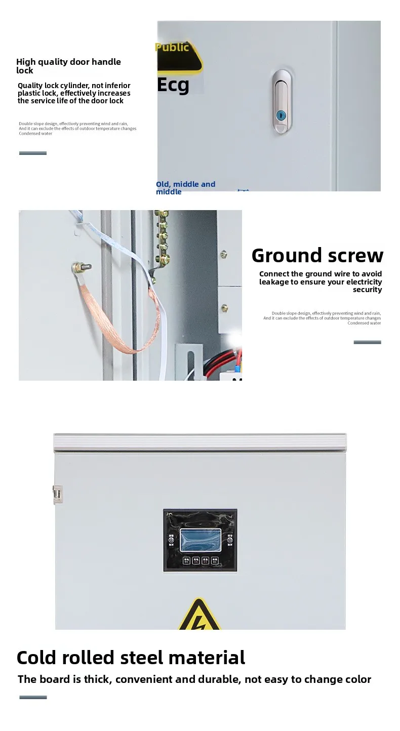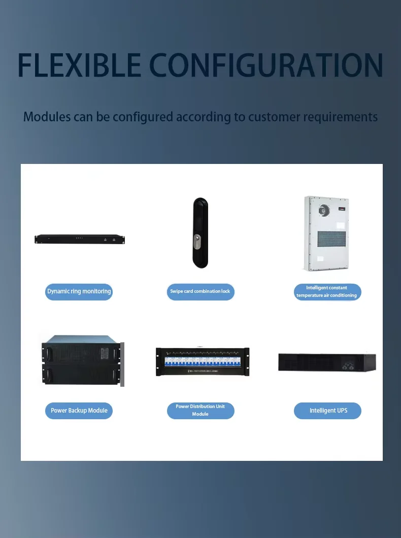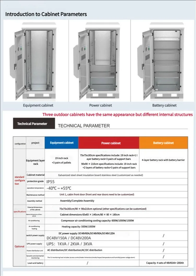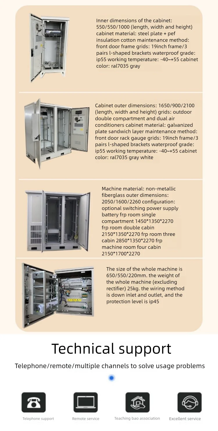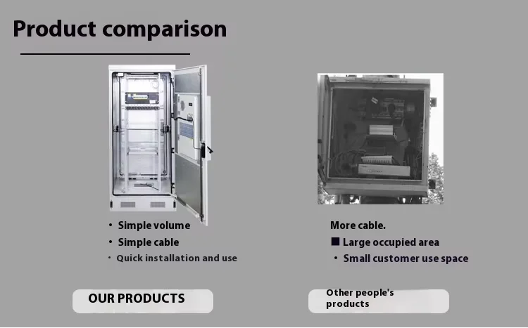 The outdoor cabinet design has good waterproof, dustproof, and rodent proof functions.The box is made of all steel structure and equipped with polyurethane sealing strips.The door uses pin type hinges to prevent dust and water from entering the box.In addition, the cabinet has a rainproof groove structure, further enhancing its adaptability to outdoor environments.The equipment compartment cabinet adopts a ventilation and heat dissipation design to ensure that the equipment maintains a stable temperature during operation.