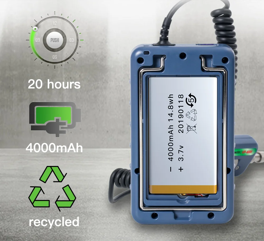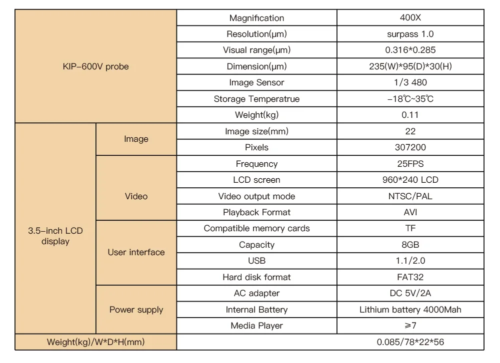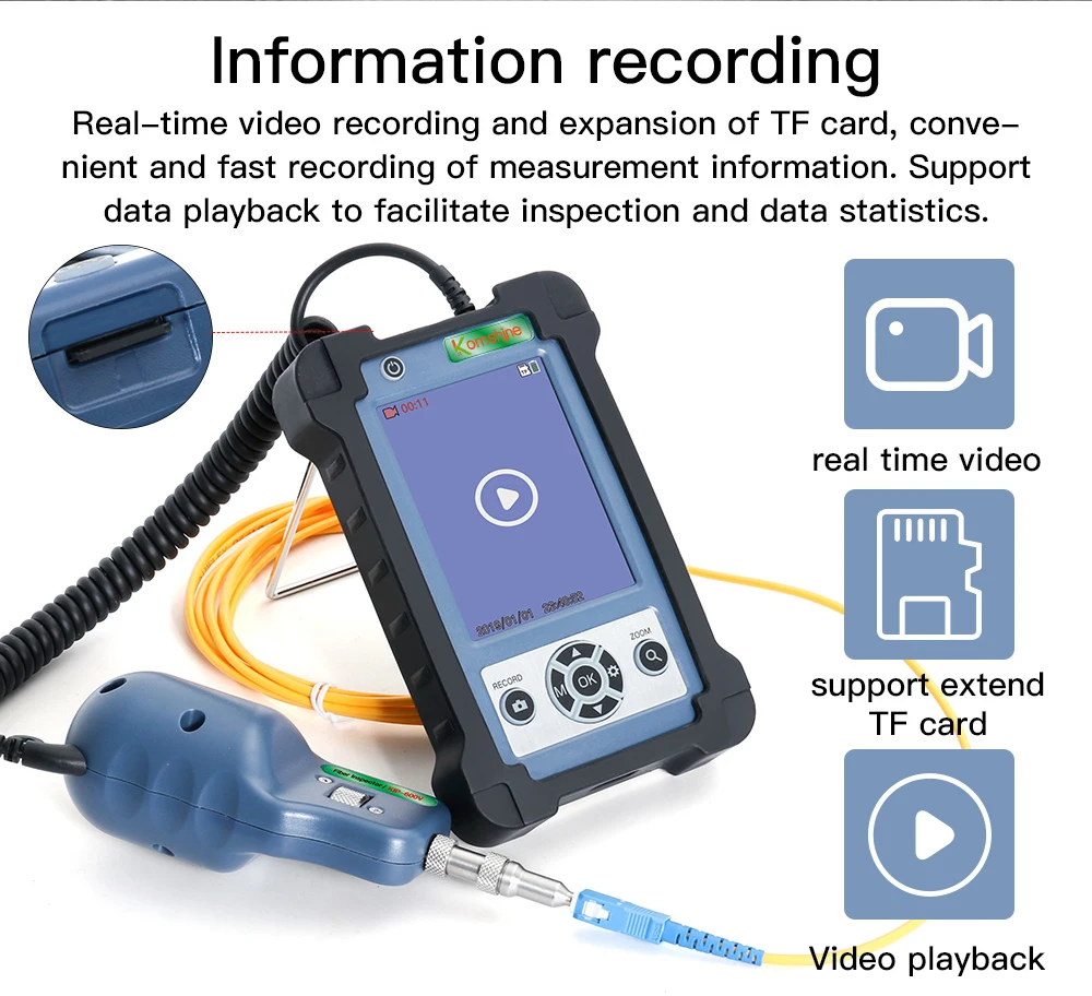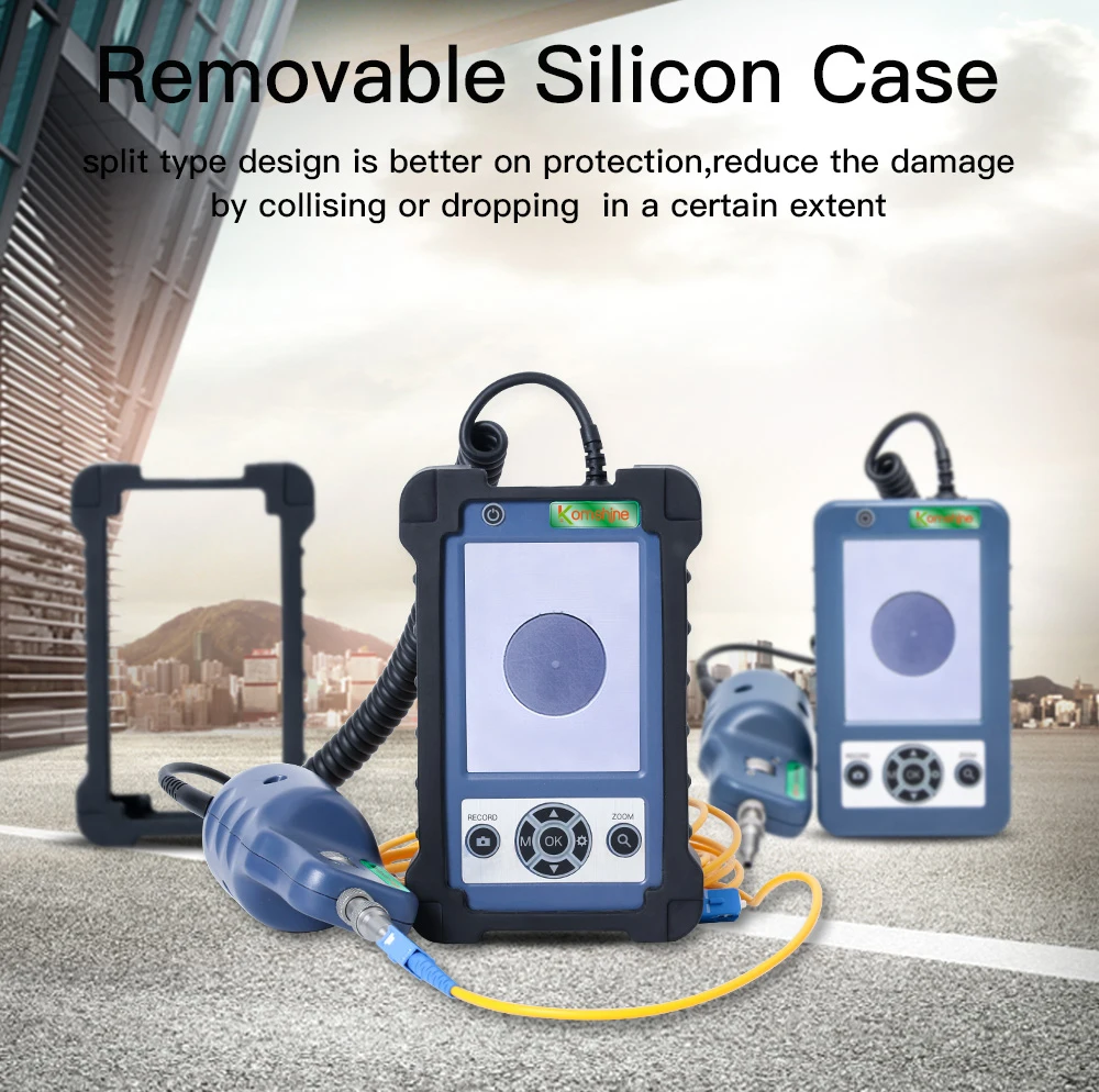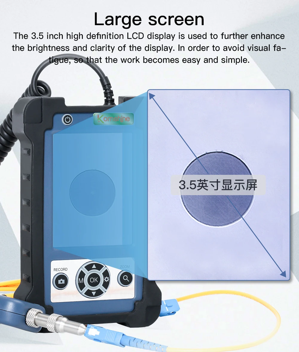 Product characteristics Rotary metal bracket, stable and convenient. 400 times magnifcation, the stain is Compatible / FC/SC/ST/LC/SC female clearly visible. connector/LC male connector 3.5 inch HD LCD display. 4000mAH large capacity lithium power, 1/3 inch sensor, 300,000 effective pixels. 20 hours standby. removable Silicon Case,reduce the damage real time video,support extend t-flash card by collising or dropping in a certain extent ,quick check the pollution degree of female Small size, one-handed, convenient and fast. connector and male conector