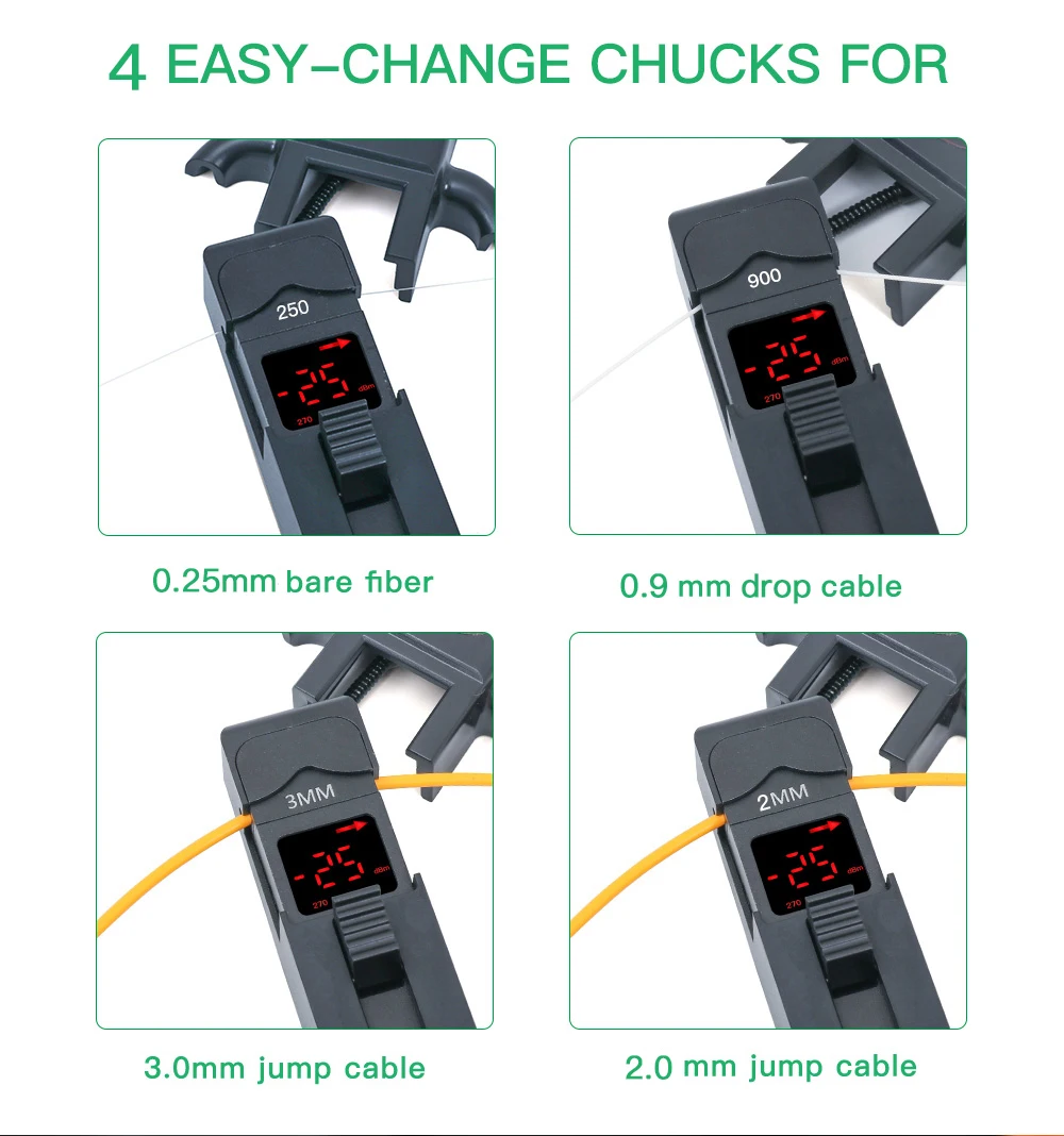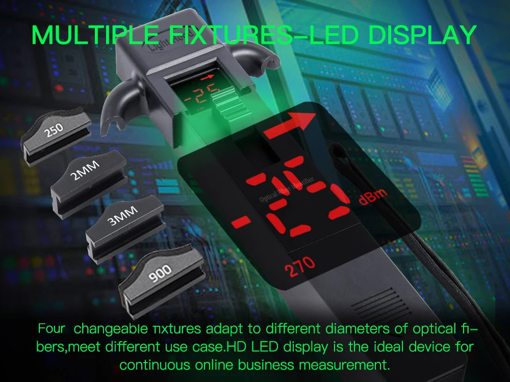 Four changeable nxtures adapt to different diameters of optical f-bers,meet different use case.HD LED display is the ideal device forcontinuous online business measurement.