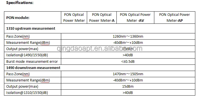 PON Optical Power Meter target at the FTTx application and maintenance.This power meter is able to simultaneously test and estimate the signals of the voice, data and video.It is an essential and ideal tool for the construction and maintenance of the PON projects.