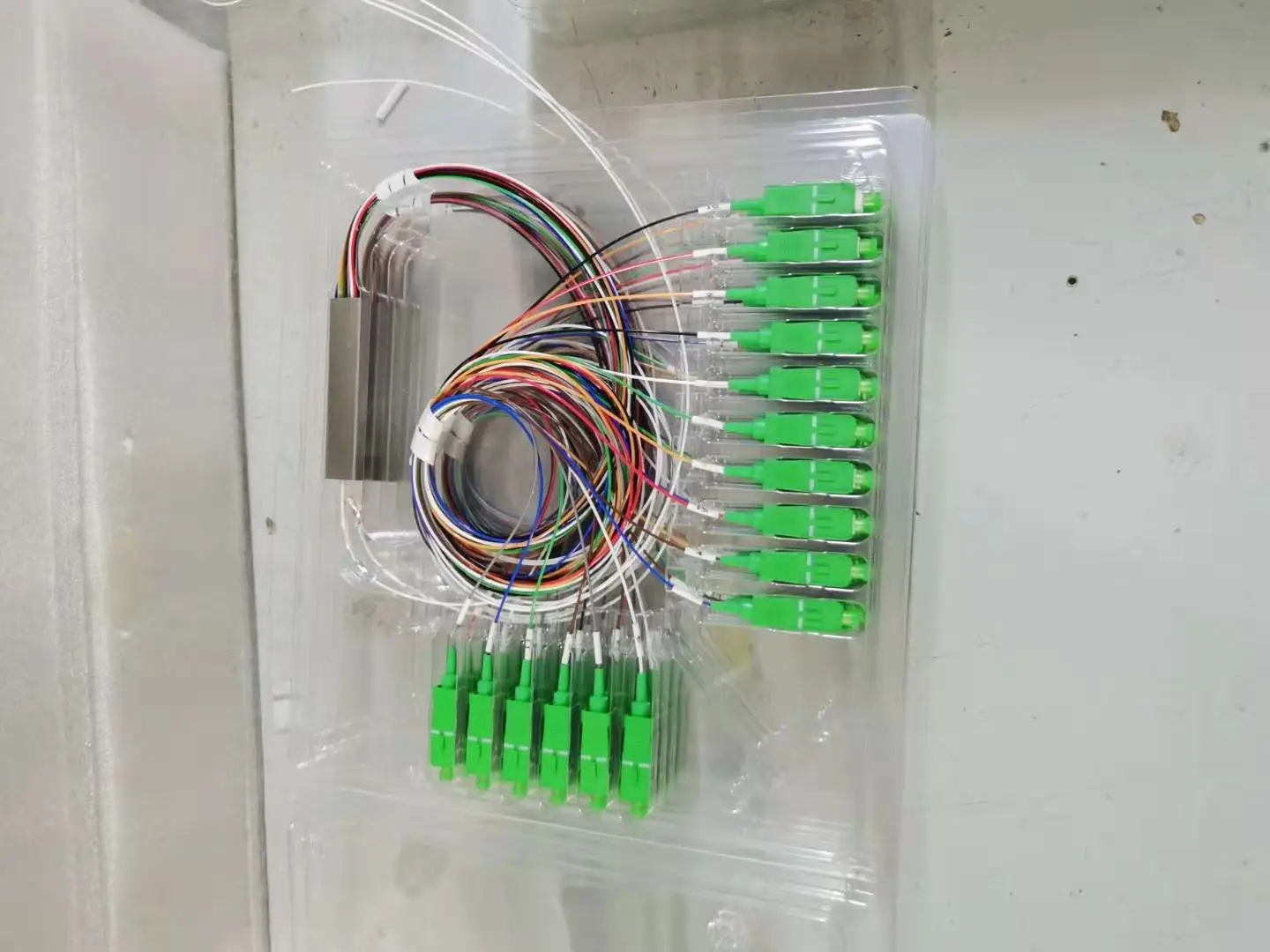 optic 1x16 fiber splitterPlanar Lightwave Circuit (PLC) Mini Module Splitter with SC/APC termination.Fabricated using silica optical waveguide