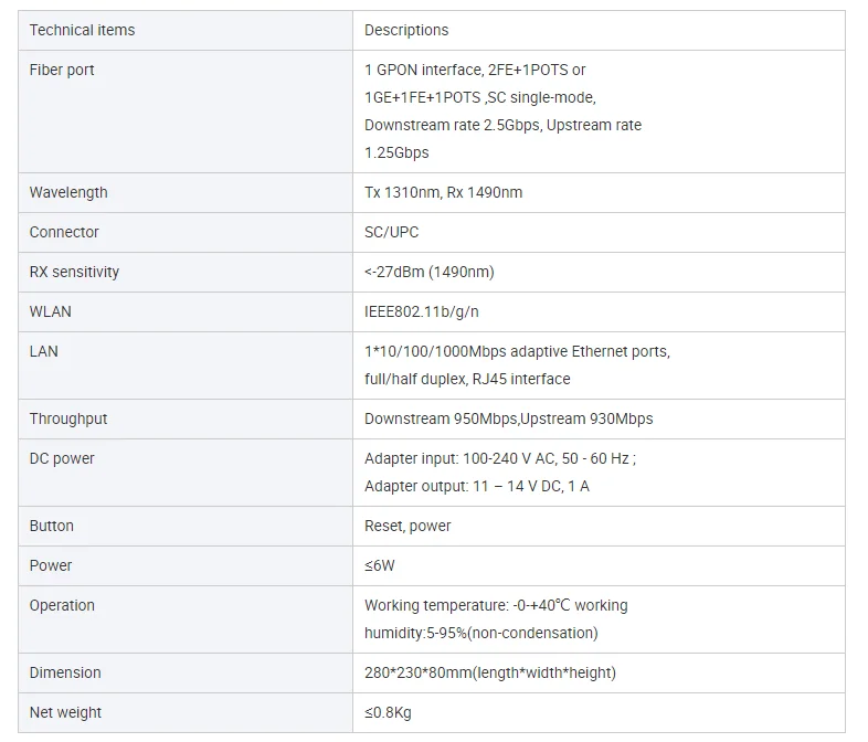 Huawei GPON ONU HG8321R with 2*FE ports+1*phone ports, or 1GE ports+1*FE ports+1*phone ports.