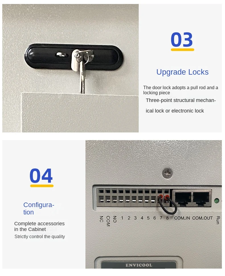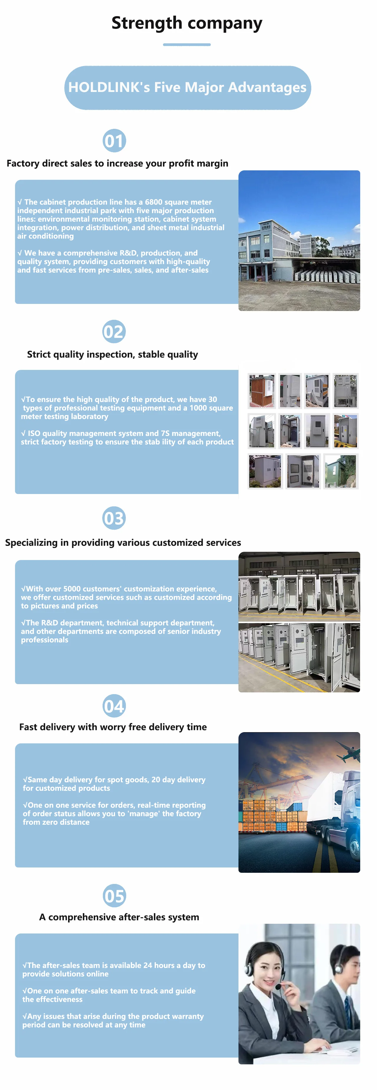 Made of metal or non-metal materials, with a protection level of IP55 or above, it has the ability to prevent dust, water, and corrosion, and can adapt to a wide temperature environment from -40℃ to+60℃.The exterior of the cabinet is mostly made of hot-dip galvanized sheet with a thickness of ≥ 1.5mm, and the metal parts are treated with hot-dip galvanizing to improve weather resistance.Support compartment structure design (equipment compartment, battery compartment, etc.), including heat exchangers, semiconductor air conditioning or direct air cooling systems, which can be quickly deployed and save 70% of floor space.The cabinet door adopts a double opening method, with no exposed screws on the outside to avoid theft through external disassembly.